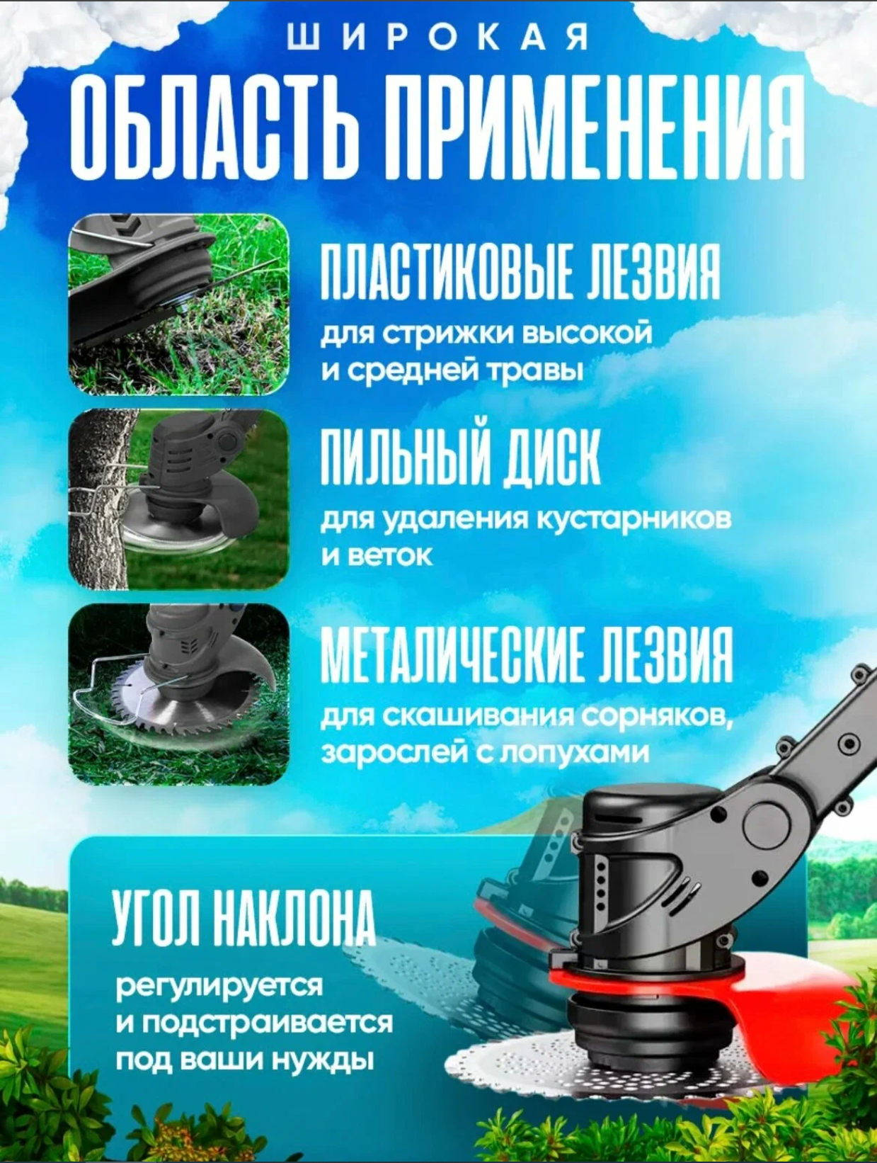 Это устройство имеет широкий спектр применения и подходит для стрижки небольших кустарников, парков, дач, тротуаров, террас и многого другого.